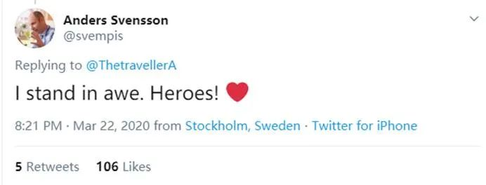 但他並不覺得自己是英雄,認為自己只是一個熱愛自己工作的普通人,為自己目前能在前線工作,能與一羣偉大的人一起付出自己的一切,感到驕傲。