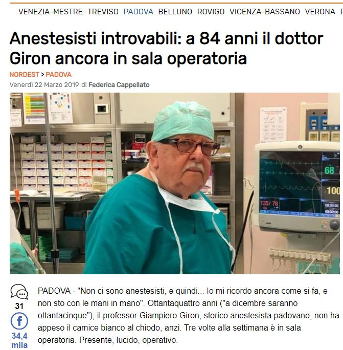 而且,同那位73歲的老醫生一樣,這位85歲的老醫生也有着光輝的歷史。根據意大利媒體的介紹,他曾參加過在1985年11月14日進行的意大利首例心臟移植手術,並擔任了那場手術的麻醉醫師。即便在他退休之後,他也是一直在醫院中幫忙,甚至仍會在手術室裏給病人們進行麻醉,多的時候一週三次…