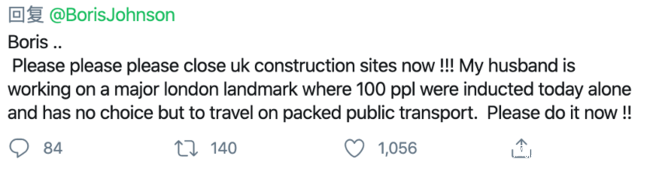 “鮑里斯,請立即關閉英國建築工地!我的丈夫正在倫敦一個建築工地上工作,一天就有100人入職。他還只能乘坐擁擠的公共交通工具出行。請現在就關閉建築工地!”
