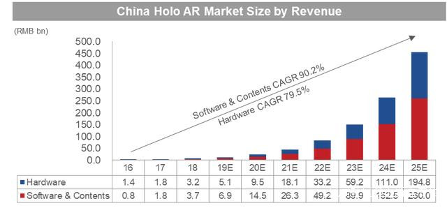 據沙利文數據調查推測,19年中國全息AR市場規模約為120億,25年將達到4550億,年複合增長率高達83%。其中AR軟件&內容增速90%,AR硬件增速73%,這是一個剛剛起步、高速發展的朝陽行業,未來的發展空間不可限量。