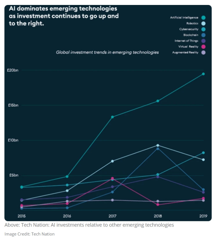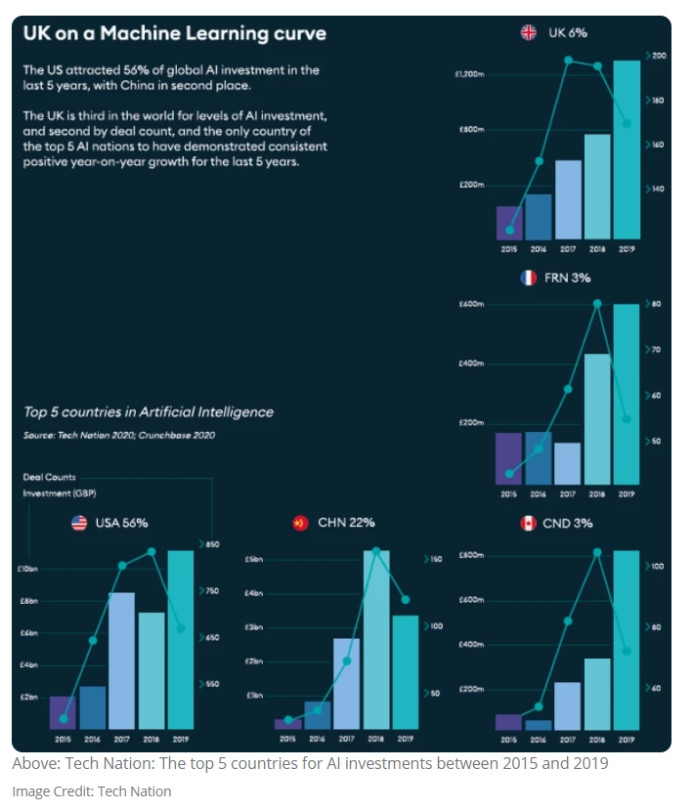 值得注意的是,Tech Nation報告中的數字可能與其他報告略有不同。例如,美國國家風險投資協會(NVCA)報告稱,2019年美國有1356家與AI相關的公司籌集了180億美元,顯然高於Tech Nation報告的約850家AI公司籌集了約147億美元。但是,這些差異主要歸因於報告衡量的標準略有不同。根據Tech Nation的洞察負責人George Windsor的説法,該報告特別關注那些關注在“正在開發面向市場的AI技術”的VC投資。這可能將現有技術應用於新領域或應用程序的AI公司相對立。換句話説,Tech Nation在其報告中關注的範圍比較窄。