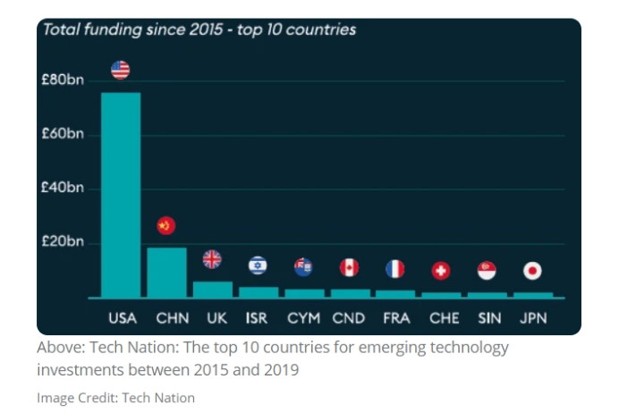 “新興技術”被定義為人工智能、機器人技術、網絡安全、區塊鏈、物聯網(IoT)、虛擬現實(VR)和增強現實(AR)。根據這份報告,在過去的五年裏,其中有10個國家的新興技術投資佔全球總量的91%。美國以750億英鎊(920億美元)的對內投資位居第一,其次是中國和英國。