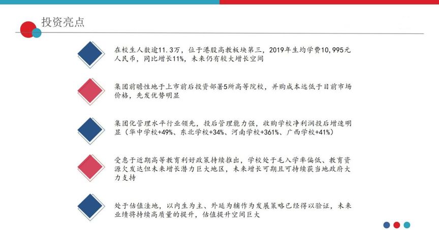 二是新高教在上市前後(2016-2017年)有前瞻性地投資併購了5所高等院校,相比於如今的價格而言“相當合算”。在民辦高教板塊大熱的今天,質量基本等同的標的,價格將明顯高於四五年前。下手早、執行力強,“抄底”標的換來了很大的先發優勢。