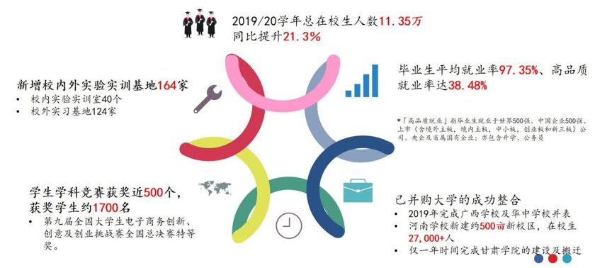 第二,旗下學校在校生人數達11.35萬人,同比增長21.3%。集團各院校2019年畢業生就業率97.35%,平均月薪4559.8元、同比增長1036元;高品質就業率為38.48%。