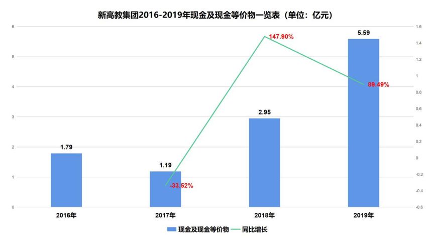 2019年末,新高教持有的現金及現金等價物為5.59億元,同比增長近90%、也是三年前1.79億元的3倍左右。