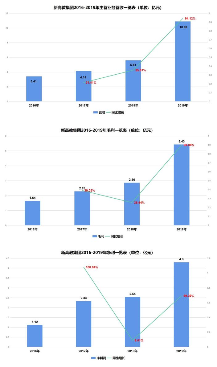 經過三年時間,新高教主營辦學業務的營收、毛利均翻了三番,淨利甚至翻了近四番。三年之中,2018年是新高教業績增速的低點,2019年則是高點。無論是營收、毛利還是淨利,2019年的增長基本都在70%以上。在眾多業績數據中,72%的總營收增幅甚至都不夠顯眼。2019年新高教的主營辦學業務營收為10.89億元,同比增長高達94.12%,比總營收增幅還高出20個百分點。