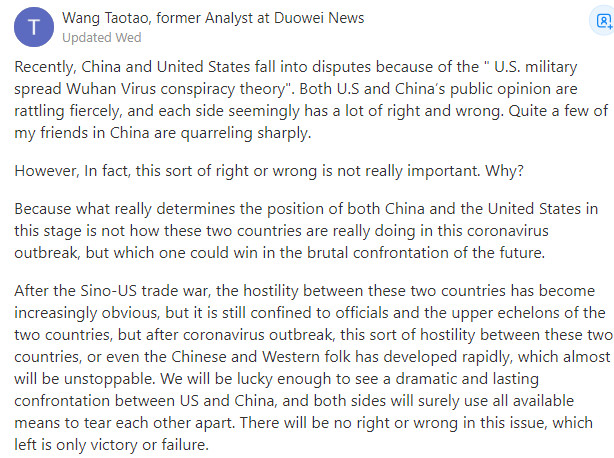 中美貿易戰後,兩國間的敵對情緒日益明顯,但仍侷限於兩國官員和高層,但在冠狀病毒爆發後,這種敵對情緒迅速發展,甚至中西方民間的敵對情緒也在勢不可擋的迅速發展。我們將有幸看到美中之間的戲劇性持久對抗,雙方一定會利用一切可用的手段將對方撕裂。在這個問題上,沒有對錯,只有勝利和失敗。