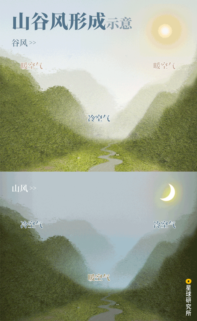 (山谷風形成原理示意,製圖@鄭伯容/星球研究所)