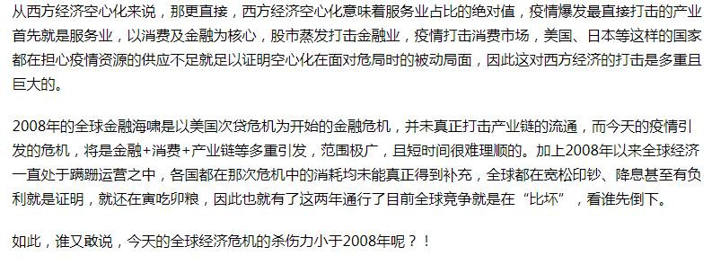 關於現階段救急行業的定義,在全球疫情大危機的環境下,我認為取決於對國內外利潤的吸取能力。現在問題是,全球疫情大危機會造成什麼?會造成全球消費總需求的下降,會造成金融投資萎縮,同時因為疫情的封鎖現狀,會造成全球製造業產業鏈的中斷與重組可能,也會造成各國加強本身自有產業的自給能力,這一切將會關聯影響整個製造業、消費服務業及金融業的聯動下滑,這是與2008年全球金融海嘯的最大危機區別(可見作者拙作《平民視覺:新冠疫情對全球格局影響》如下圖節選)。而且關鍵是目前全球疫情大危機已經完全蔓延開並逐步失控,因此奢望在今年6月以前控制住是不太可能的,這樣影響的週期就更長了。