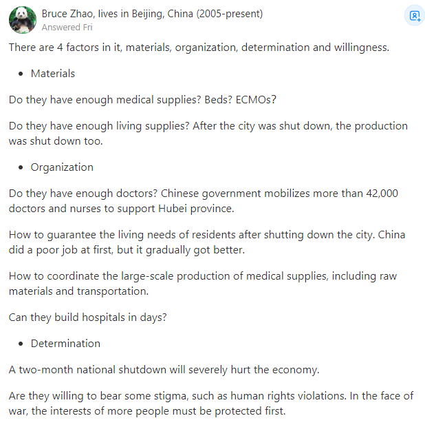 PS:問題的另一方面是,中國的部長們往往不善於言辭。事實上,他們往往連一種普通大眾都能聽懂的語言都不會説,因為他們的主要受眾是像他們這樣的其他專業人士。例如,中國衞生部在2月10日對醫生們進行了一次談話,內容是“你需要儘快採取措施越快越好。採取積極措施。即使沒有條件這樣做,你也需要創造這樣做的條件。”唯一真正明白他們所説的話的人是其他熟悉Covid-19治療的ICU醫生。基本上衞生部説他們收集的臨牀數據顯示病人應該儘早插管,不要等到他們的血氧水平急劇下降。如果他們用完了陰性室,他們仍然需要穿上合適的衣服來做插管(因為有些醫生不會在普通的ICU病房做插管)。插管對醫生有風險。醫生在插管時與病人面對面接觸,因此他們這樣做時感染的風險極高)。