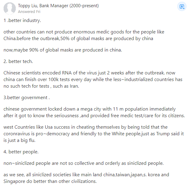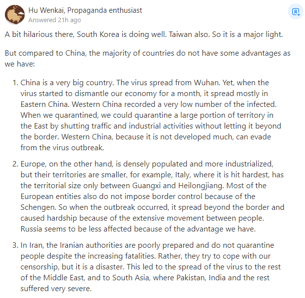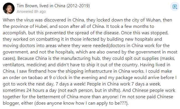 因為中國是製造業的中心,他們可以輸出產品(口罩、呼吸機、藥品),而不必將其運出中國。在中國生活過之後,我親眼目睹了中國的航運基礎設施是如何運作的。我可以在晚上9點在淘寶上下訂單,我的包裹會在第二天上班前送到,一週7天都是如此!中國人每週工作7天,有時一天24小時(不是每個人,而是輪班)。中國人民比任何人都更為中國的進步而共同努力!我不是一個收了錢的中國博主(有人知道我該怎麼申請嗎??)。