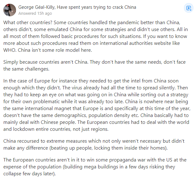 還有哪些國家?一些國家比中國更好地應對了這種流行病,而其他國家沒有。一些國家在某些策略上效仿中國,而沒有使用其他策略。總之,他們中的大多數人都遵循了處理這種情況的基本程序。如果你想了解更多關於這些程序的信息,請在世界衞生組織等國際權威網站上閲讀。中國在這裏不是什麼榜樣。