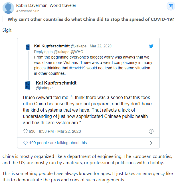 當病毒在中國被發現時,他們封鎖了湖北省武漢市,不久之後封鎖了整個中國。這花了幾個月才完成,但這阻止了疾病的傳播。一旦這種情況得到制止,他們就致力於建造新醫院和將醫生轉移到需要的地區和受到感染的人身上與之作鬥爭(中國的醫生為ZF工作,而不是醫院,在大多數情況下,醫院也歸ZF所有)。