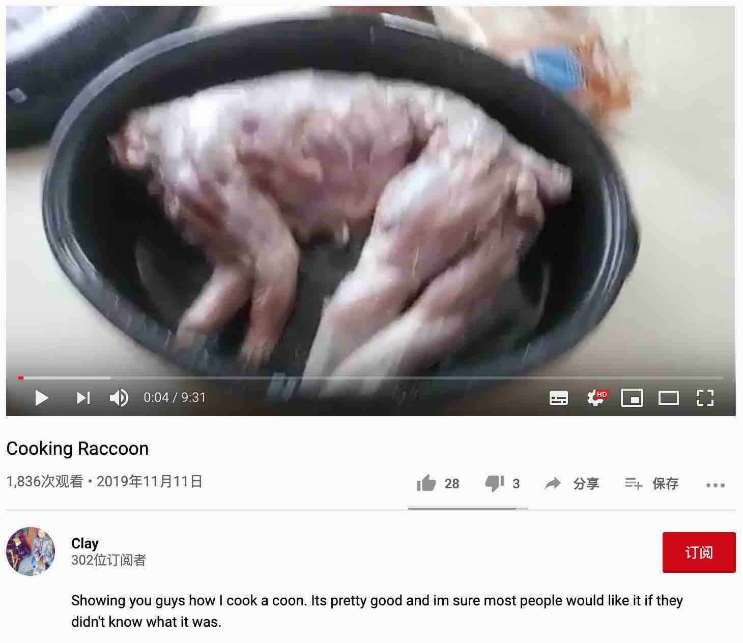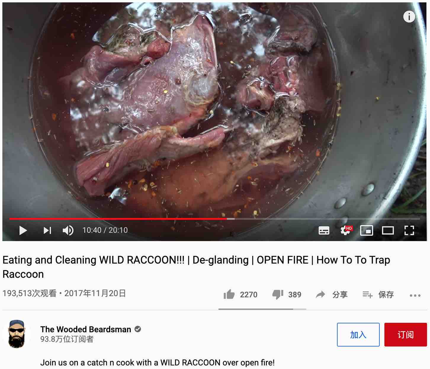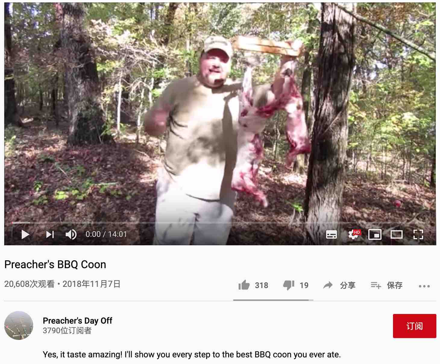 浣熊。你能想象嗎?就是那個作為各種病毒(包括狂犬病毒)宿主的浣熊!隨便一搜,就看到不少展示美式浣熊大餐的視頻。我隨便選了幾個美國播客抓捕和烹飪浣熊視頻,截圖如下: