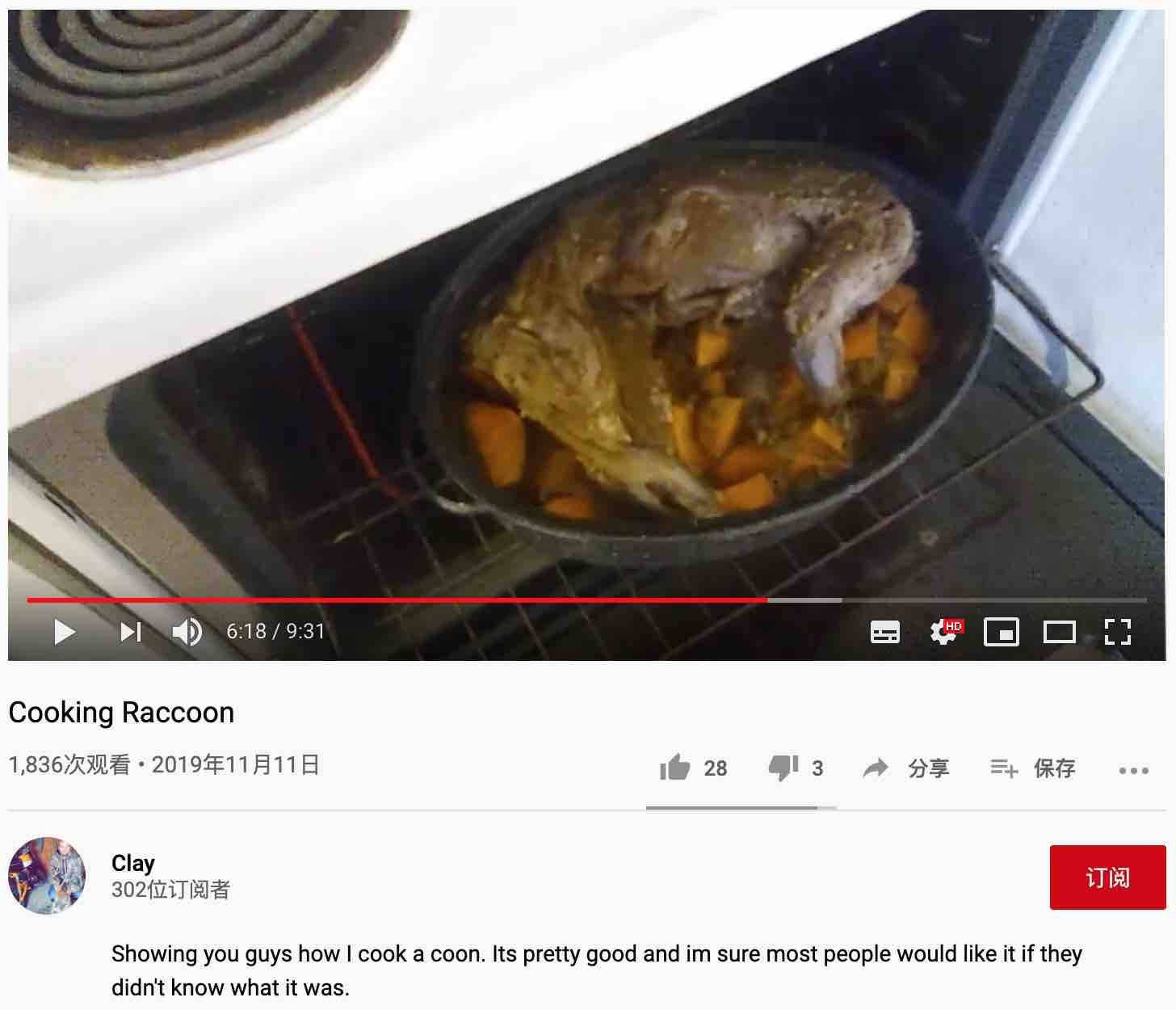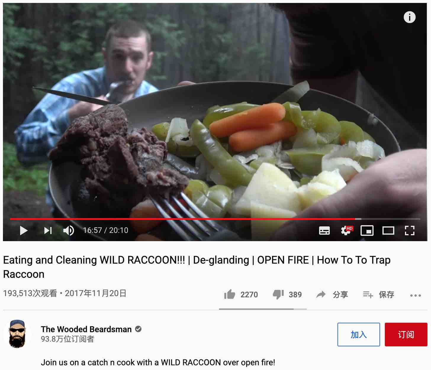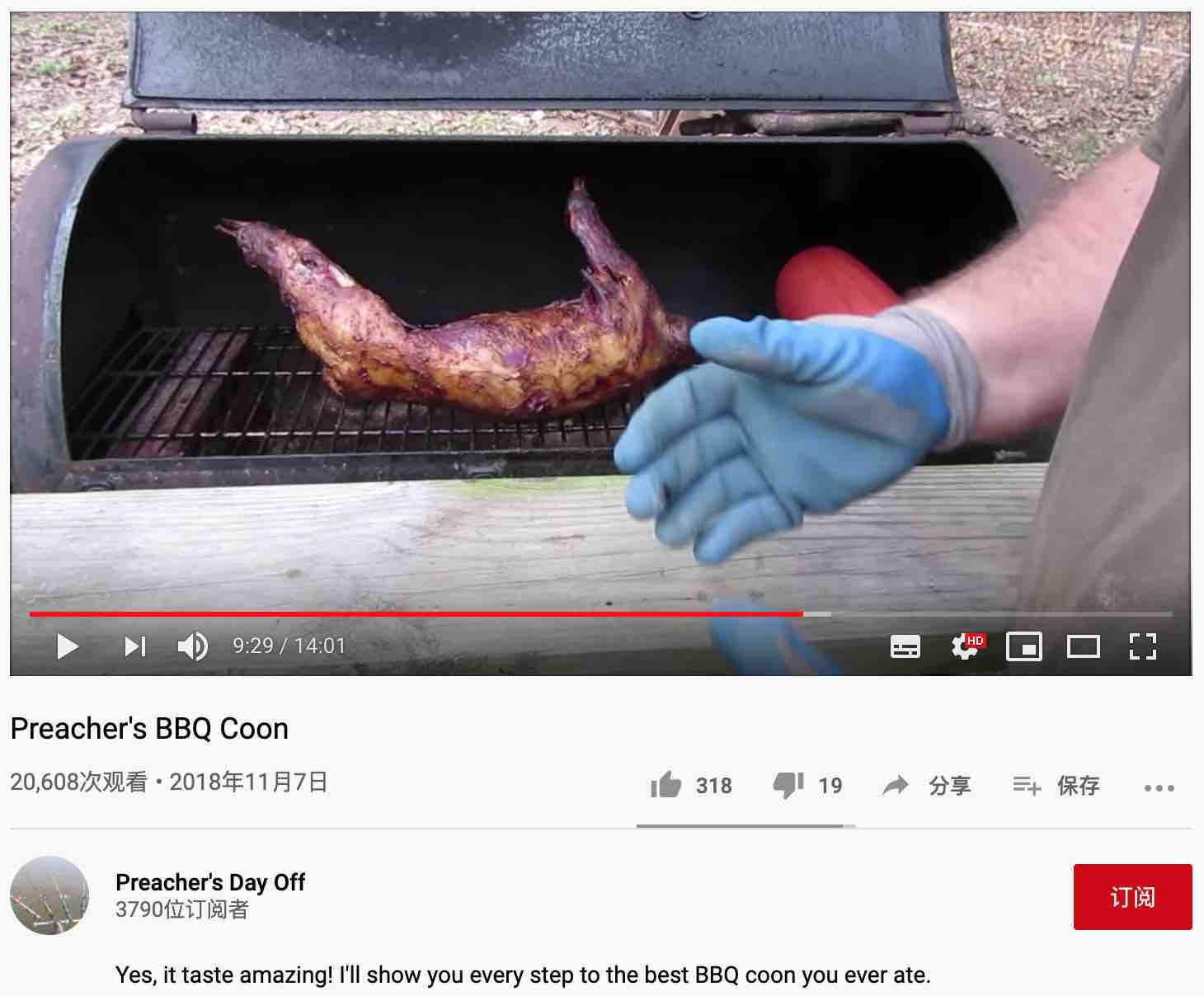 浣熊。你能想象嗎?就是那個作為各種病毒(包括狂犬病毒)宿主的浣熊!隨便一搜,就看到不少展示美式浣熊大餐的視頻。我隨便選了幾個美國播客抓捕和烹飪浣熊視頻,截圖如下: