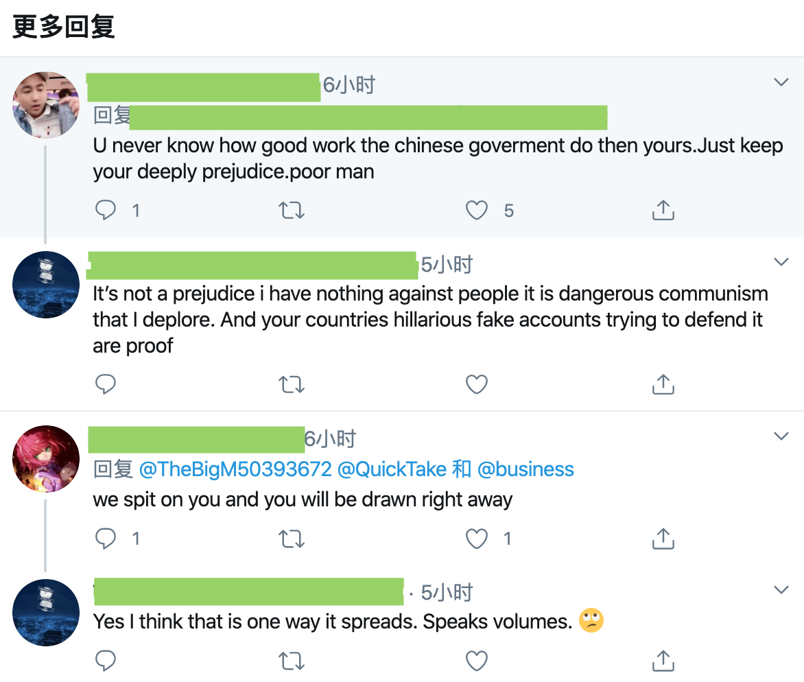 比如下面的兩位同胞。第一位説,“你完全不知道中國政府比你的政府做得有多好。你就繼續保留你的深度偏見吧,可憐人。” 對方回應:“這不是偏見。我對中國人民沒有惡意,我鄙視的是危險的共產主義。你們國家的可笑假賬號試圖維護它就是證據。” 這位同胞就試圖以理服人,想通過維護自己祖國來批駁對方。但是人家根本不在乎你的國家或者你的政府有多能幹,他就是仇視,就是要抹黑,跟這樣的人講道理是沒用的。而且敵視中國的西方人總是説對方是“五毛”,這個詞在仇中勢力中已經非常普及,或者至少也會説是假賬號,這就是擺明了不接受你的反駁。
