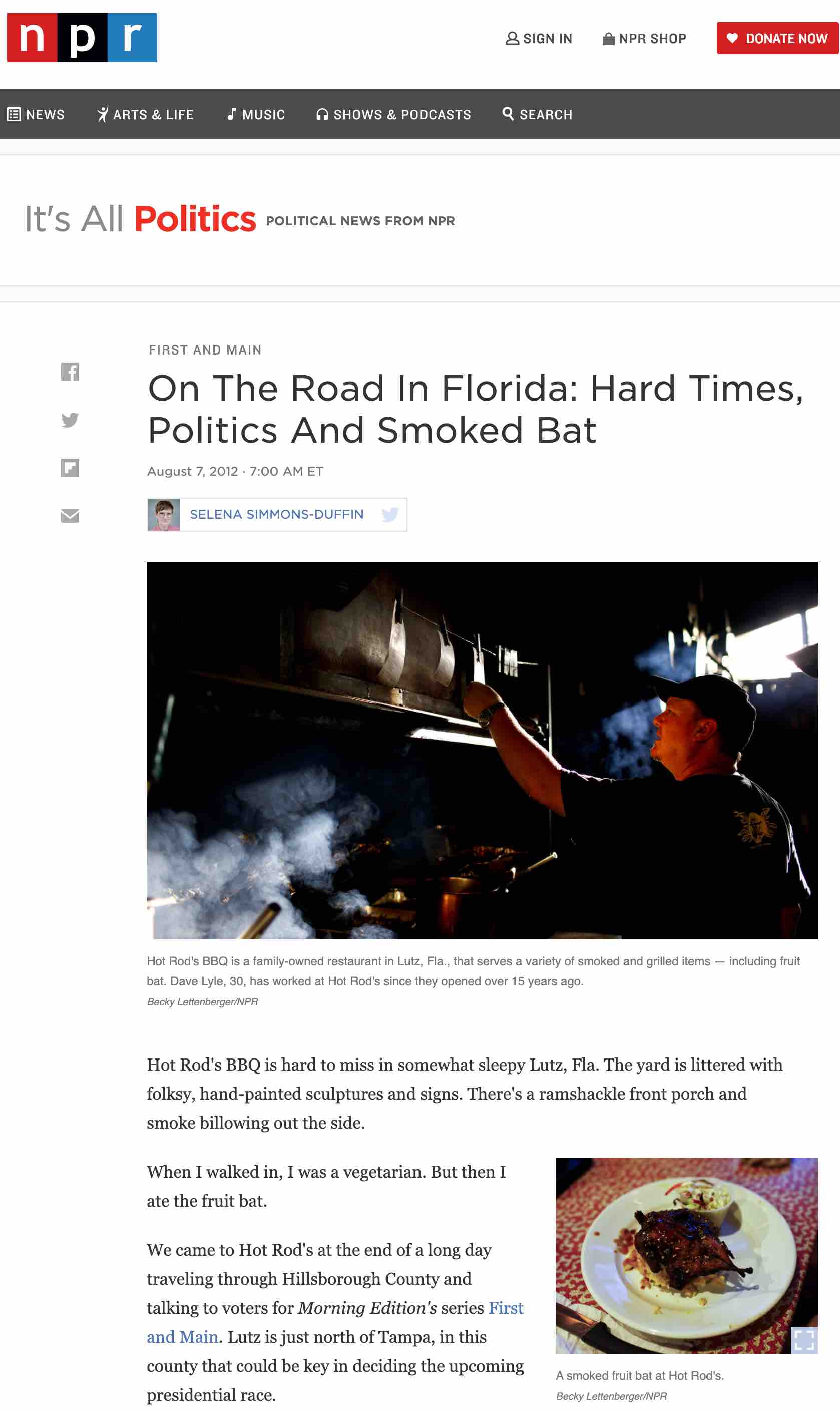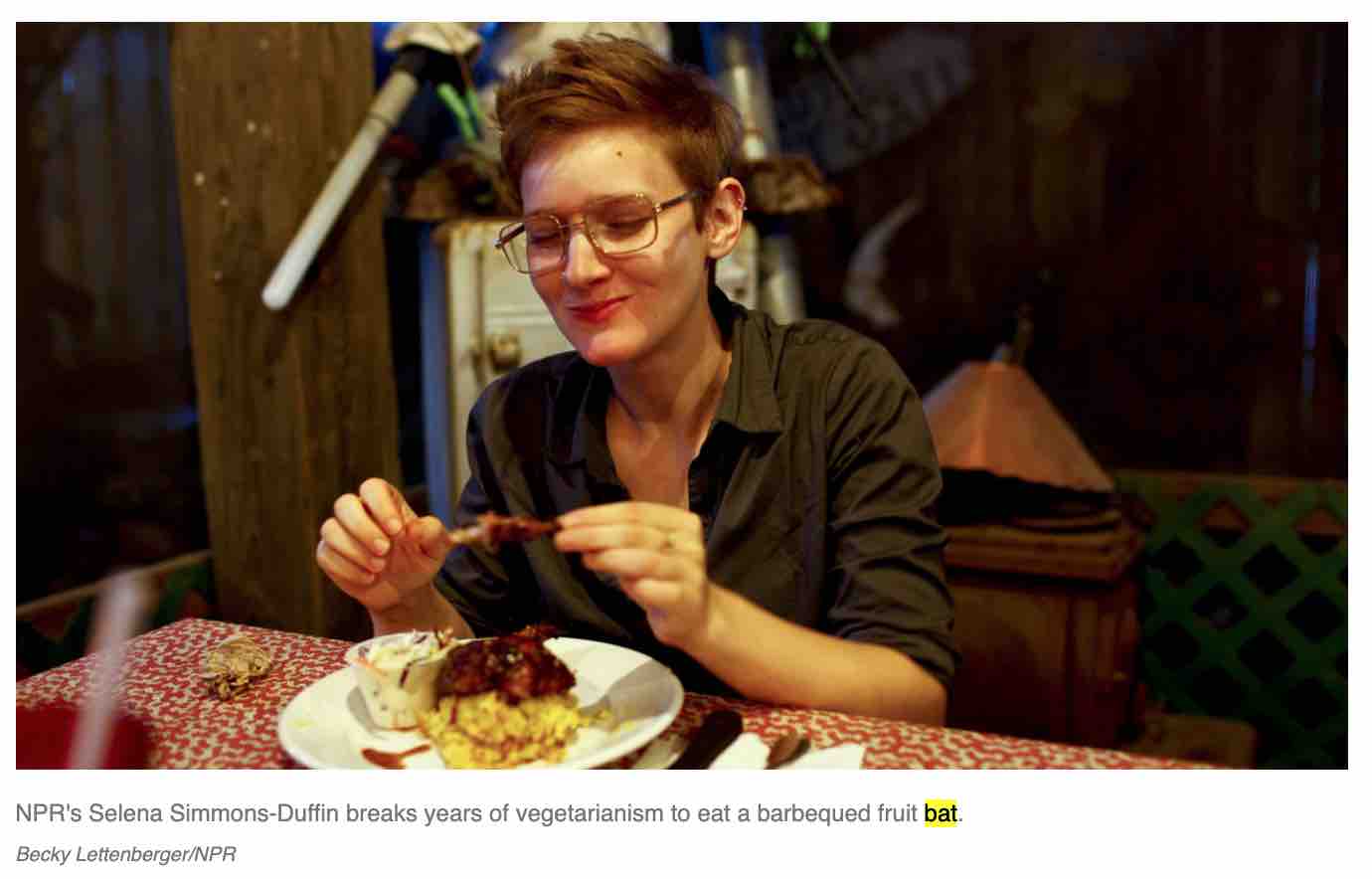 這是2012年大選期間,NPR 的一名女記者 Selena Simmons-Duffin 在美股佛羅里達州的一家餐館吃了一道菜——燻果蝠。是的,你沒看錯,也是果蝠,還是這位美國記者在美國本土的餐館裏吃的,而且津津樂道地把這個經歷當做一個新鮮有趣的經歷報道了出來。我們要承認,美國沒有吃蝙蝠的文化,就像中國沒有吃蝙蝠的文化一樣,所以這是少數,就像中國即便有吃蝙蝠的人,也是少數一樣。那麼,為何西方媒體,尤其美國媒體和美國大眾,卻對中國主播吃蝙蝠大肆渲染呢?美國的主流和非主流媒體為了爭奪流量,其職業道德,堪比我們主打老年消費羣體的養身自媒體了。