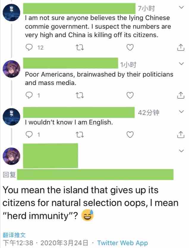 第二位同胞説,”我們往你身上吐口水,你馬上就會被拉走。” 説實話… 看到這裏我不知道該怎麼評價這位同胞的輿論工作。先看看對方的回應吧:“是的,我認為這也是一種傳播病毒的辦法。充分體現了(你們的問題)。🙄” 這就是怒不擇言,宣泄了個人的情緒,卻遭到了無情的嘲笑,旁觀者也會覺得我們的同胞不對了。