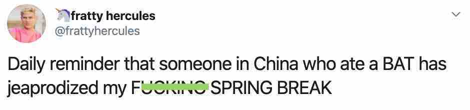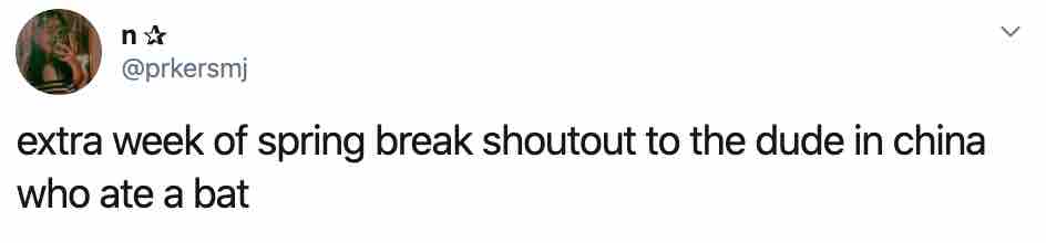 “又有一週額外的春假,感謝那個在中國吃蝙蝠的傢伙”