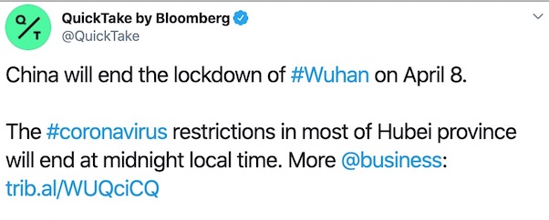 首先我們看看新聞,新聞説武漢將在4月8號解除封鎖,湖北省大部分地區將會在午夜時分解除新冠病毒的限制措施。