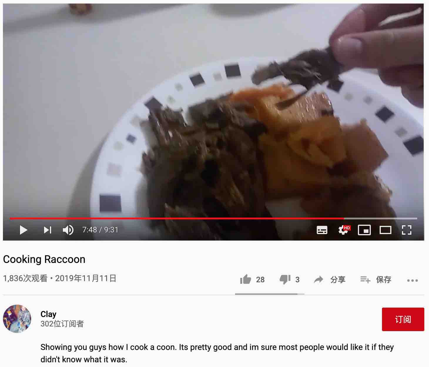 “給你滿展示我如何烹飪這隻浣熊。很好吃,我確定大部分人都會喜歡,就算他們以前不知道這是什麼菜。”