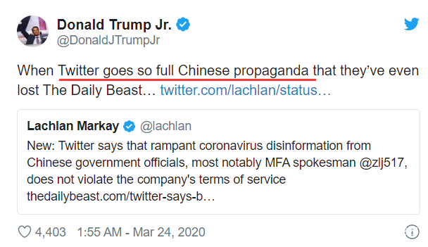不過,儘管推特在此事上看似在堅守他們的原則和底線,他們卻遭到了一些美國政客和媒體的猛烈抨擊。其中,特朗普的兒子就發帖攻擊推特成為了中國政府的宣傳工具。