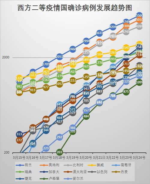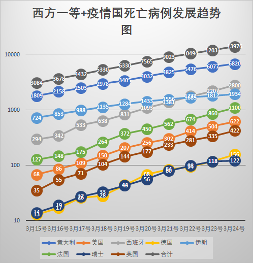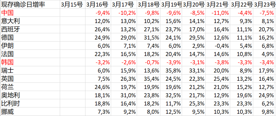 請看上圖,13條線,只有兩條下行。就是大局已定的中國和韓國。其餘11條線都在以不同的速度上行。僅餘一位數增長的是伊朗、比利時、挪威和甚至意大利!其中伊朗甚至已經出現一次小小的負數。
