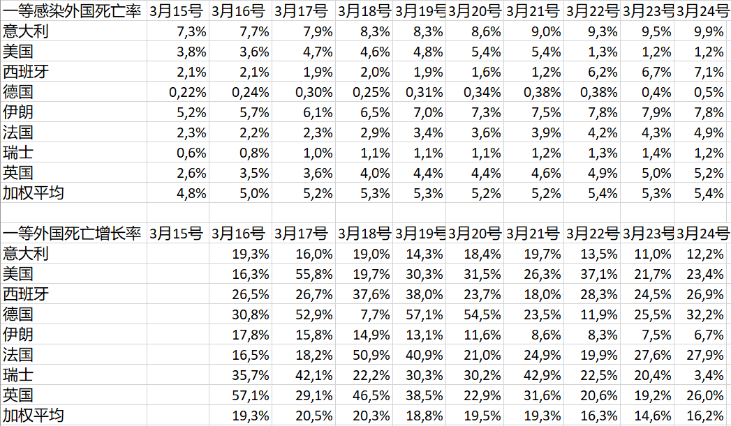 意大利的情況略有退步。新增從4790回到5248。但比前天的5560還是少,比大前天的6557更少。漲比僅從8.1%增到8.2%。因此,本人判定見好大勢沒有消失。只是暫時波動。當然我們還需要今後幾天的數據,才能真正確定意大利的發展大勢。不過筆者認為,如果意大利如此封國,情勢還不能慢慢好起來,那老天爺對它也是太過殘酷。因為那裏已經看到很多的人間慘像。比如被迫給老人拔去供氧管道等。