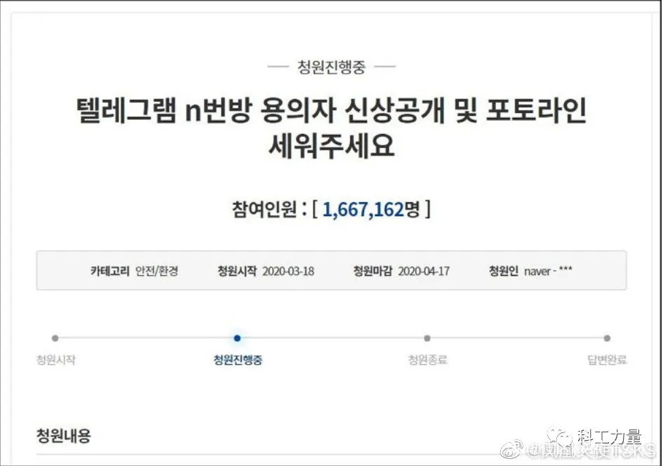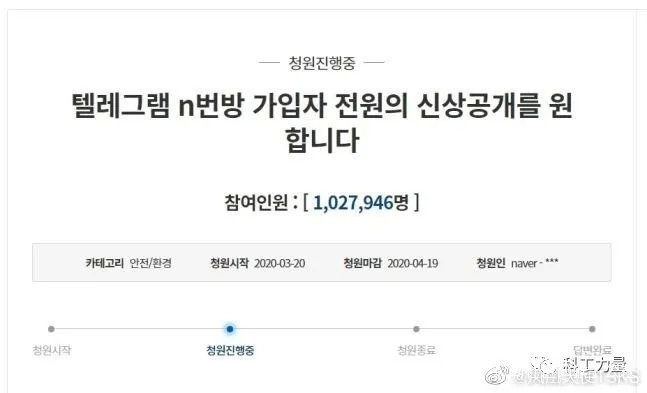 因在“Telegram n號房”內傳播淫.穢.物.品.而獲利過億韓元的所謂"博士"趙某被拘留後,韓國羣眾通過“青瓦台國民請願”版要求公開加入這個組織的人的個人資料,截至今天上午9時(當地時間),請願參與人數達到了102萬人。