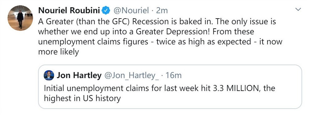 有交易員猜測,此次申請失業金的人數超過320萬,可能還有100萬人來不及申請,我們要為下週數據飆升至600萬做好準備。