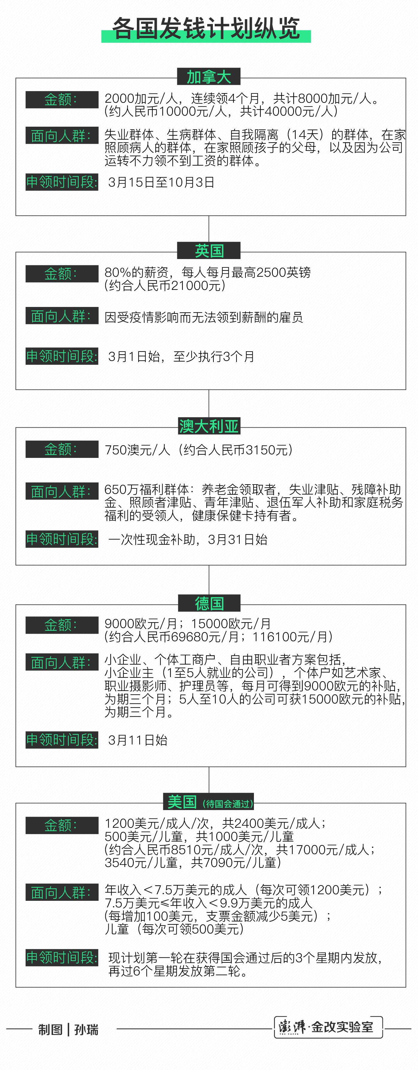 各國也因此紛紛推出“史無前例”的經濟措施,除了經濟刺激規模巨大,多國甚至直接向發錢,均創下各國“歷史上首次”的記錄。以下為澎湃新聞盤點的各國“花式撒錢”方案: