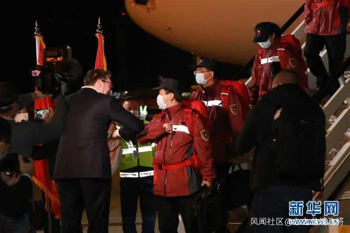北京時間3月22日,當中國派遣的醫療專家組乘坐塞爾維亞專機到達時,塞爾維亞總統武契奇帶領多位政府官員親自接機,同每一位專家組成員“碰肘”,向五星紅旗獻上了深情一吻。