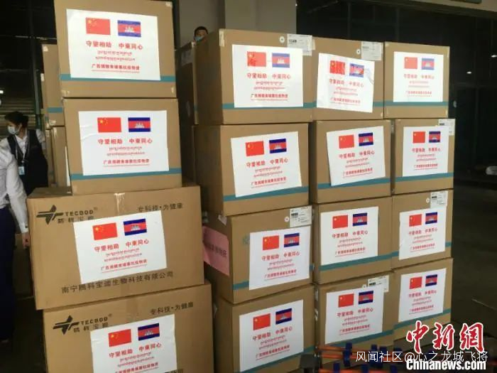 3月23日,一架搭載7名來自廣西壯族自治區醫療專家和一批防疫醫療物資的中國南航包機降落在柬埔寨首都金邊國際機場。圖為廣西捐贈柬埔寨的抗疫物資。桂衞 攝