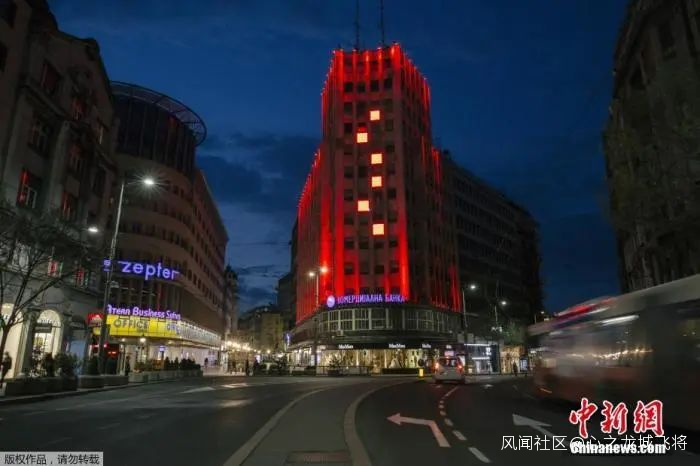 當地時間3月22日,在塞爾維亞貝爾格萊德,阿爾巴尼亞大廈點亮中國紅。