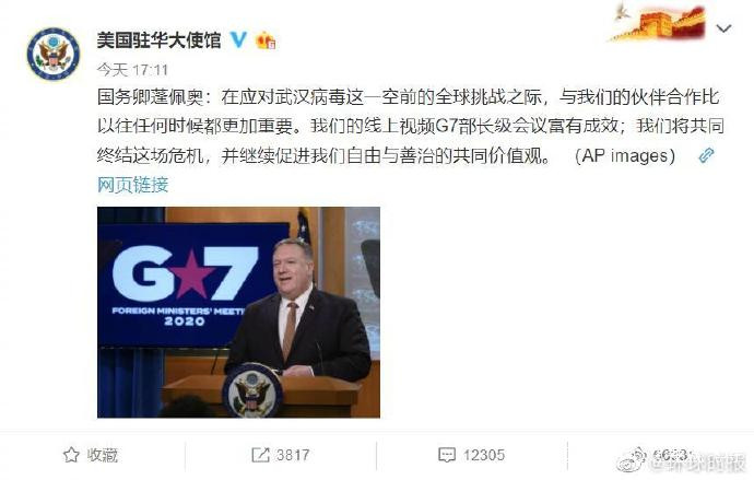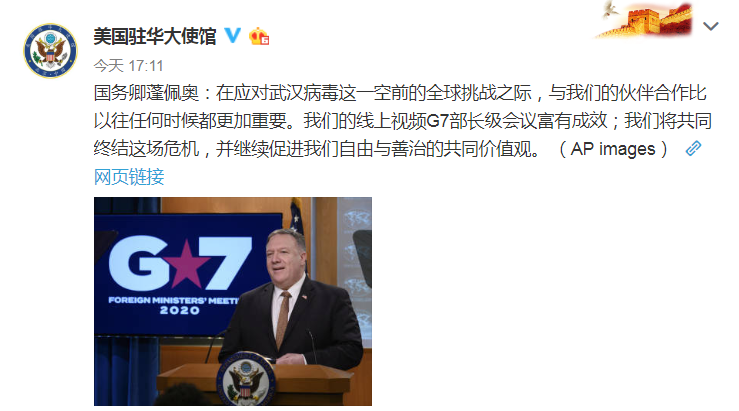 而一個小時前的第一條微博中,@美國駐華大使館 更引用美國國務卿蓬佩奧的説法,聲稱“在應對武漢病毒這一空前的全球挑戰之際,與我們的夥伴……的線上視頻G7部長級會議富有成效”云云……