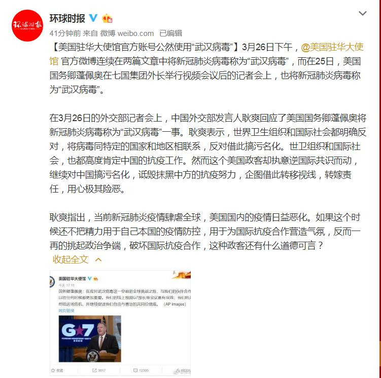 美國駐華大使館官方賬號公然使用“武漢病毒”來源:環球時報新媒體