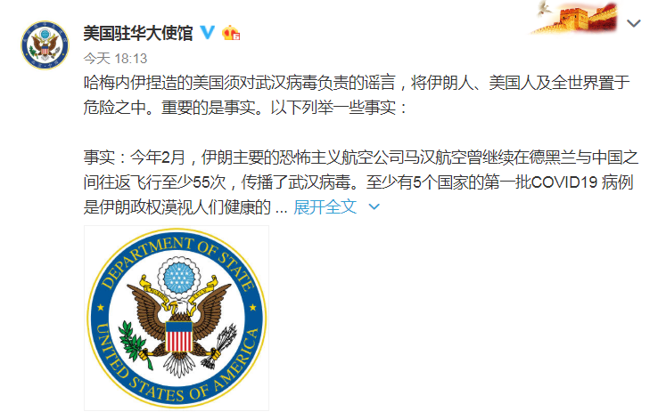 發佈於今晚18時許的第一條微博中,@美國駐華大使館 將病毒蔓延的鍋甩給伊朗,聲稱伊朗“傳播‘武漢病毒’”。