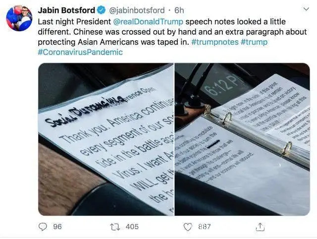 3月24日,特朗普在採訪中改口,決定不再將新冠病毒的名稱與中國聯繫在一起。當天的白宮記者會上,還有記者拍到,特朗普演講稿中的"中國病毒”被手動劃去。