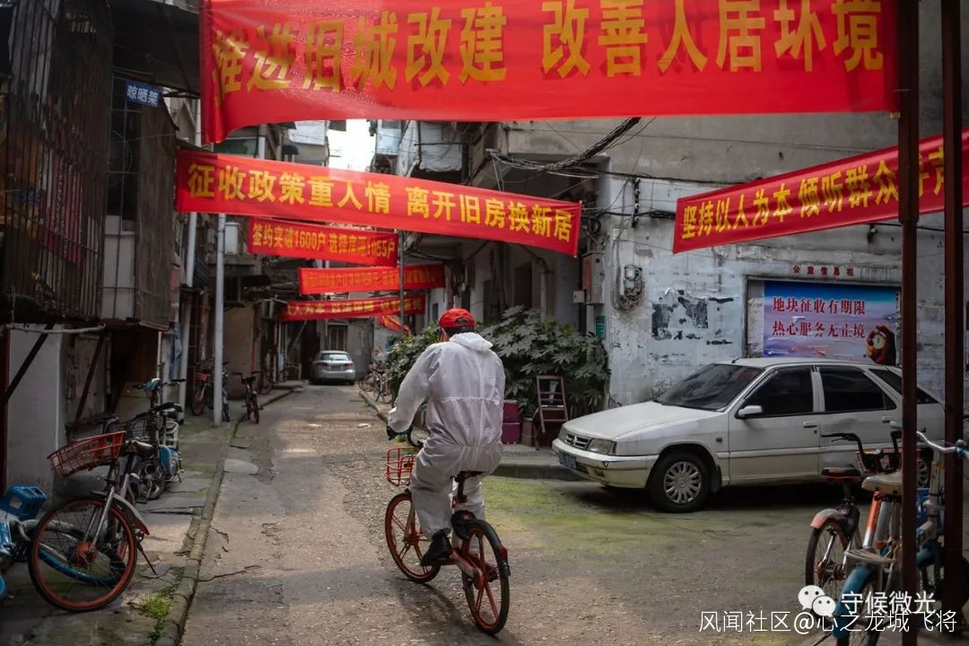 3月24日,武漢市大董社區,一名下沉幹部騎着共享單車穿行在社區裏。中青報·中青網記者 李雋輝/攝