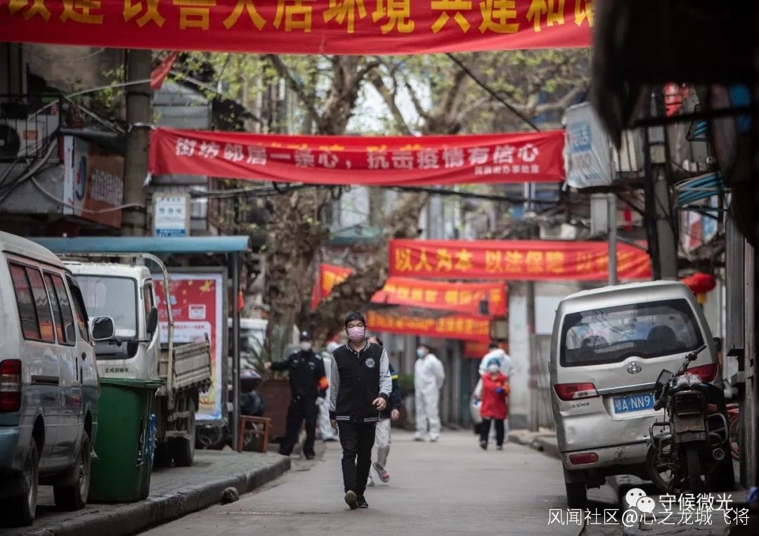 3月24日,武漢市江漢區大董社區內,居民從抗擊疫情的宣傳條幅下走過。這裏已獲評無疫情小區。中青報·中青網記者 李崢苨/攝
