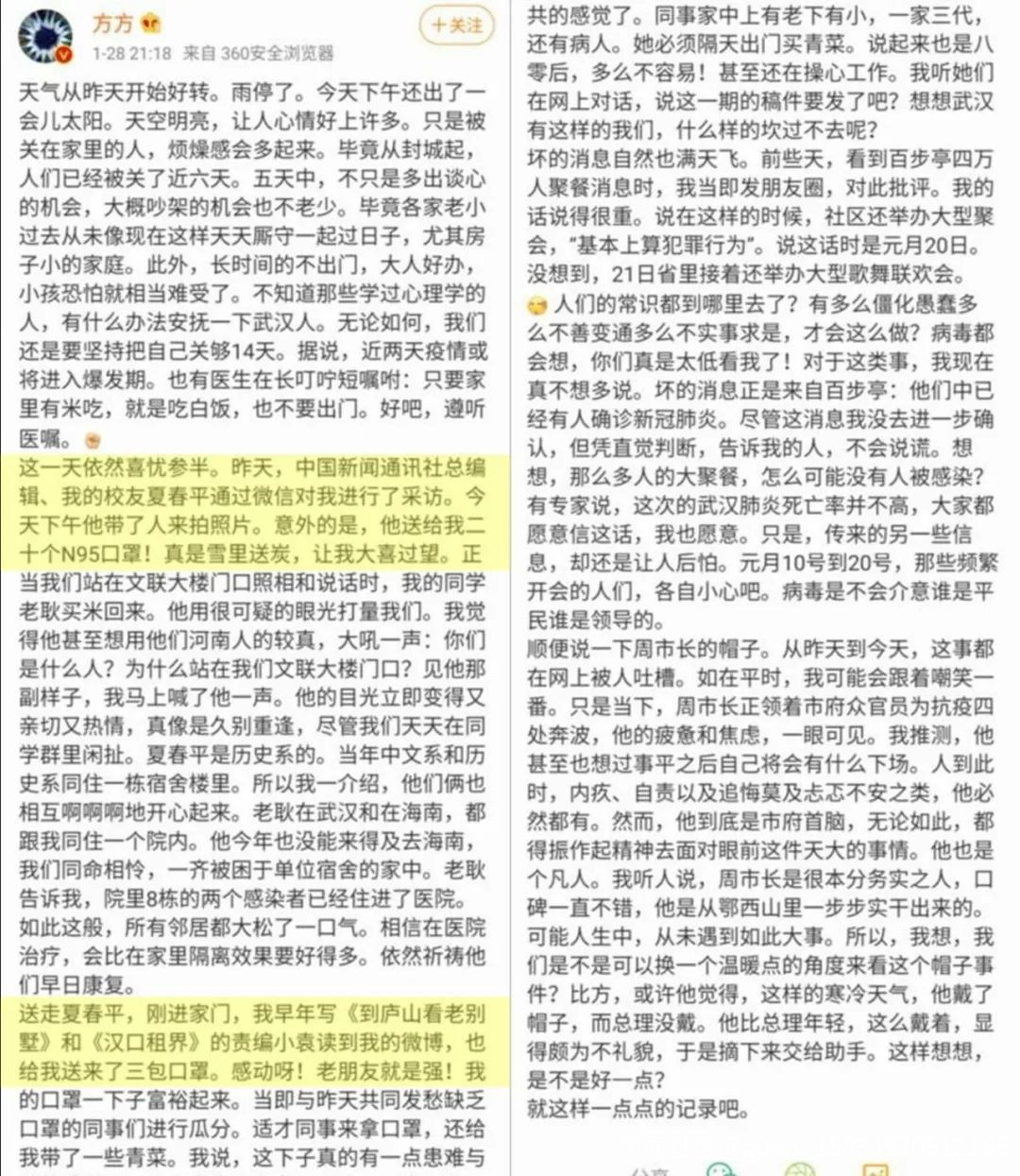 1月28日,中國新聞通訊社夏春平副總編送了方方20個N95口罩。武漢人都知道,那個時候武漢醫院裏特別缺專用口罩。在社區,下沉黨員連一次性醫用口罩都不給配。