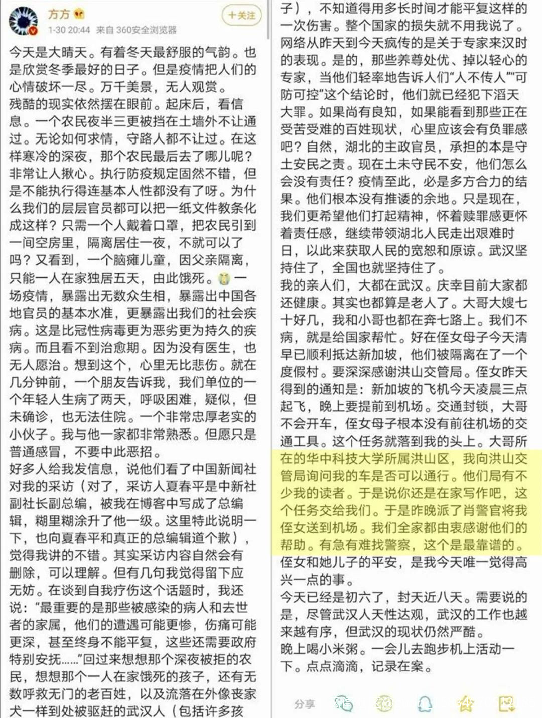 1月30日方方問警察,警察回答説上路沒問題,方方自己開車去給女兒送菜。我之前初三(1月27日)也出過門,看到的是路上全設了卡點。2月1日我也想開車出門去幫助辦理喪事,結果因為沒通行證,連社區出口那的彩虹橋都過不去。