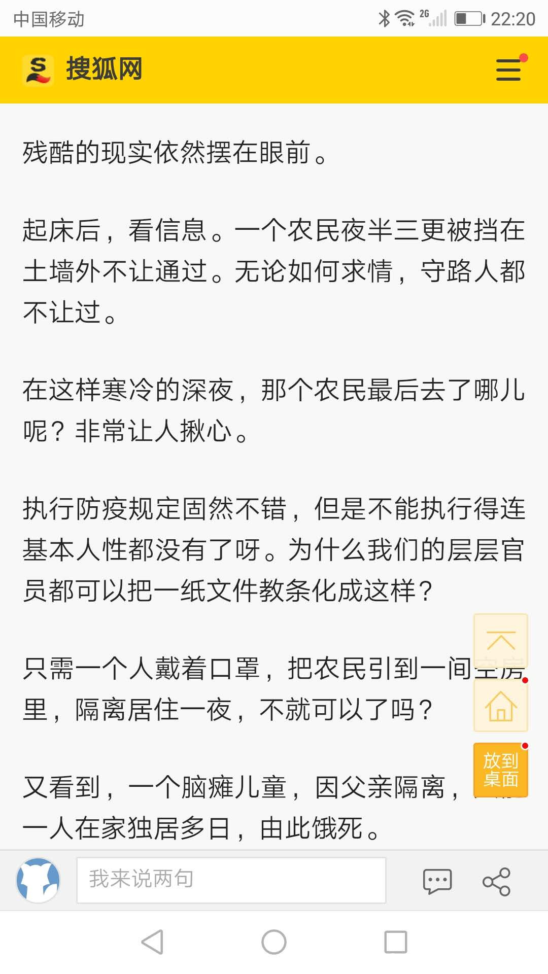 1月30日方方日記中提到:一個農民夜半三更被擋在土牆外不讓通過,無論如何求情,守路人都不讓過……執行防疫規定固然不錯,但是不能執行得連基本人性都沒有了呀。為什麼我們的層層官員都可以把一紙文件教條化成這樣?