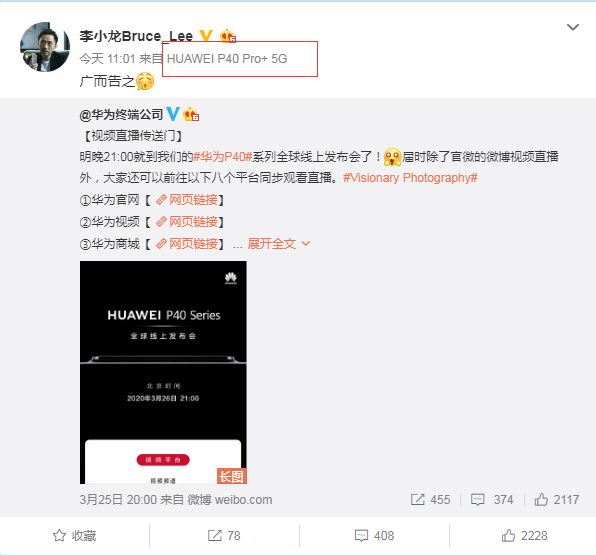 李小龍的這條微博,徹底確定了P40 Pro+(之前也被傳為P40Pro PE)的存在