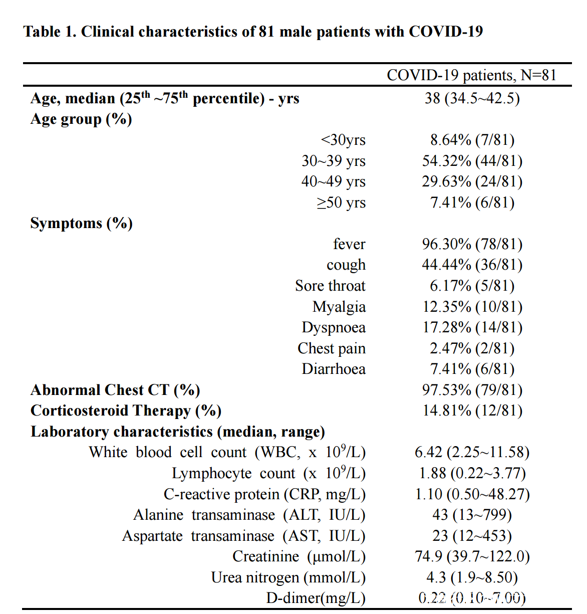 武漢大學中南醫院生殖醫學中心的這個團隊對81名男性新冠患者的血清樣本進行了回顧性研究。他們於3月5日在3月18日期間入住武漢雷神山醫院,年齡從20至54不等(中位數38歲)。