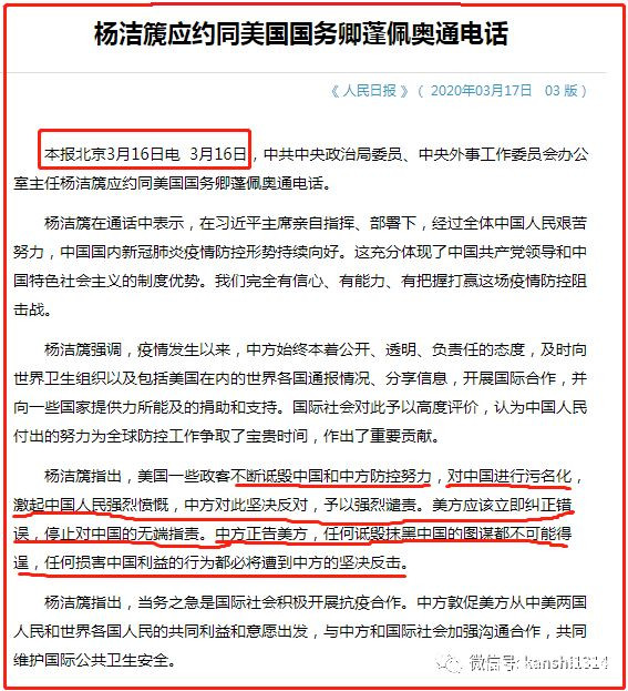 3月16日美股第三次熔斷,白宮和美聯儲救市火力用盡,但無濟於事,市場恐慌情緒達到了極值。白宮終於坐不住了,當天,一直在抹黑中國的蓬佩奧不得不跟楊潔篪通電話。這個電話實際上就是美國暗示向中國求助的。但蓬佩奧太傲慢,不給人台階下,中國哪裏會自己湊上去犧牲。結果就是,楊潔篪把此次“應約”通話,變成了對蓬佩奧屢次抹黑中國的抗議。