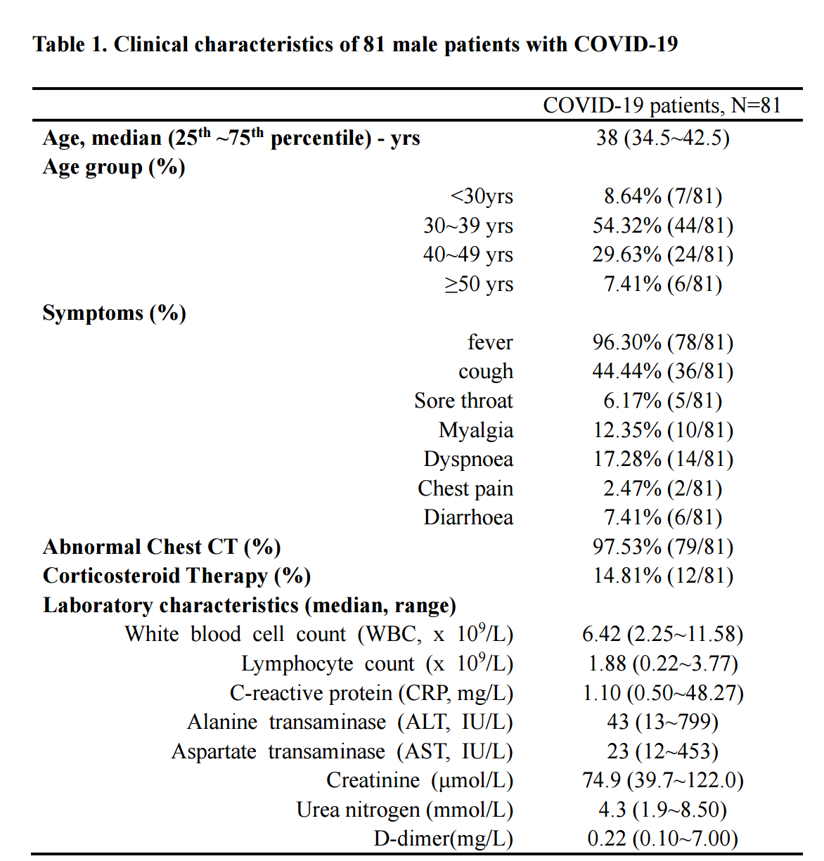 武漢大學中南醫院生殖醫學中心的這個團隊對81名男性新冠患者的血清樣本進行了回顧性研究。他們於3月5日在3月18日期間入住武漢雷神山醫院,年齡從20至54不等(中位數38歲)。
