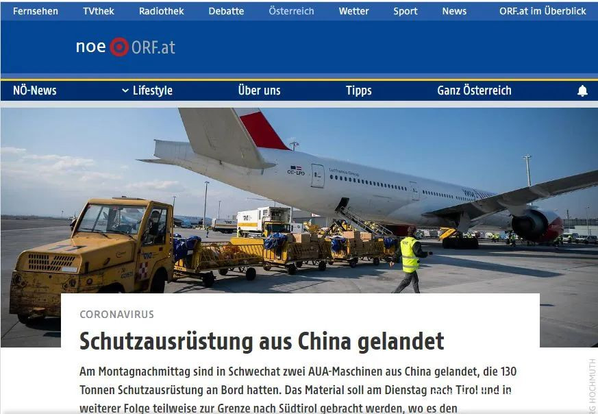 3月23日,兩架載着中國130噸防護物資的飛機抵達奧地利維也納施韋夏特機場。