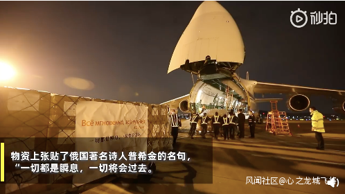 這架飛機是用來運輸馬雲捐贈給俄羅斯的醫療物資的,物資上張貼了俄國著名詩人普希金的名句,“一切都是瞬息,一切將會過去。”