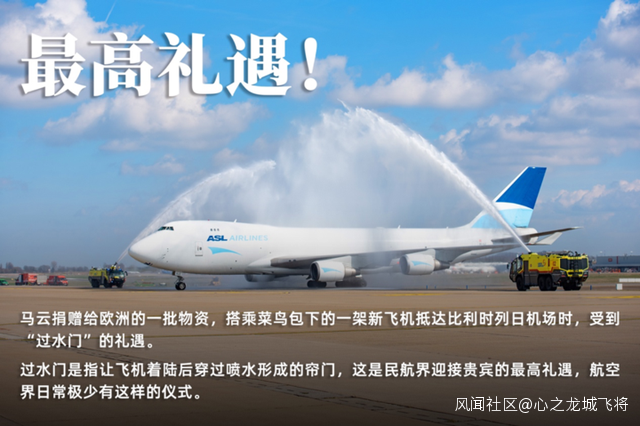 3月18日晚,馬雲捐贈給法國、斯洛文尼亞、比利時的一批醫療物資,抵達比利時列日機場時,受到“過水門”的禮遇。過水門是民航界迎接貴賓的最高禮遇。